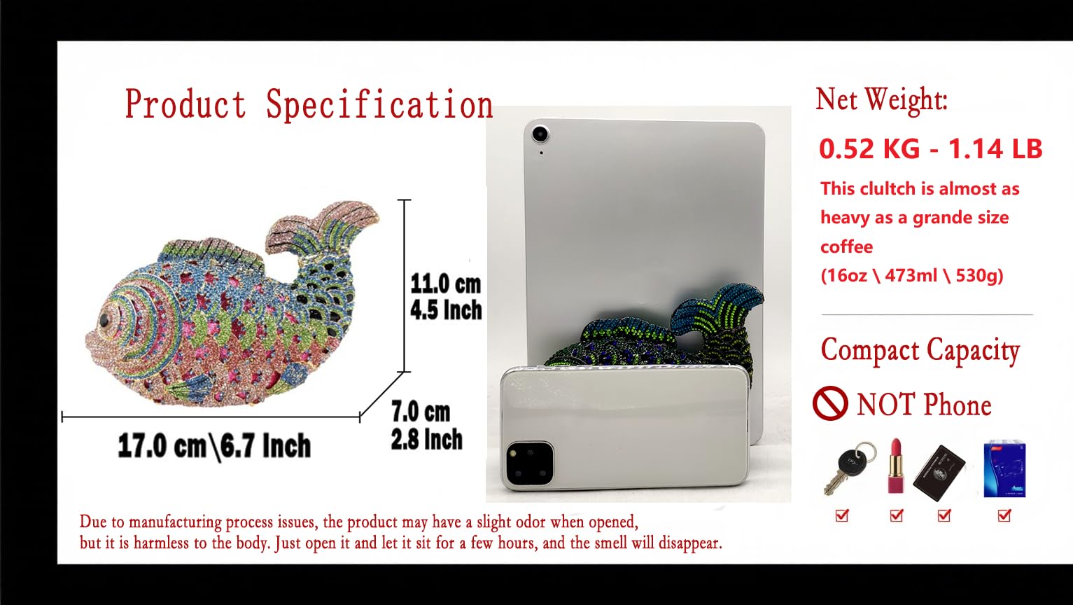 - Heavy-Weight and Gift Packed: Weighing 1.14 LB ( 0.52 KG ), This goldfish-shape handcraft minaudiere clultch is as heavy as a grande size Coffee (16oz 473ml 530g). It is safe in transit, It is packed with a black velvet pouch and a gift box and then put into a hard carton