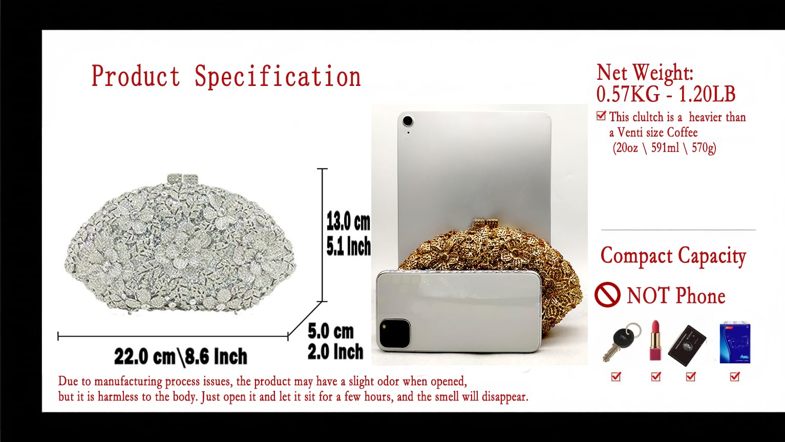 - Heavyweight & Portable: Weighing only 0.70 KG (1.5 LB), this flower crystal clutch is crafted with a solid metal frame and high-quality materials, ensuring durability while maintaining a luxurious feel. The robust construction adds a premium touch to your evening ensemble Its compact design makes it an ideal evening clutch purse for those who prefer style without the burden of heavy accessories