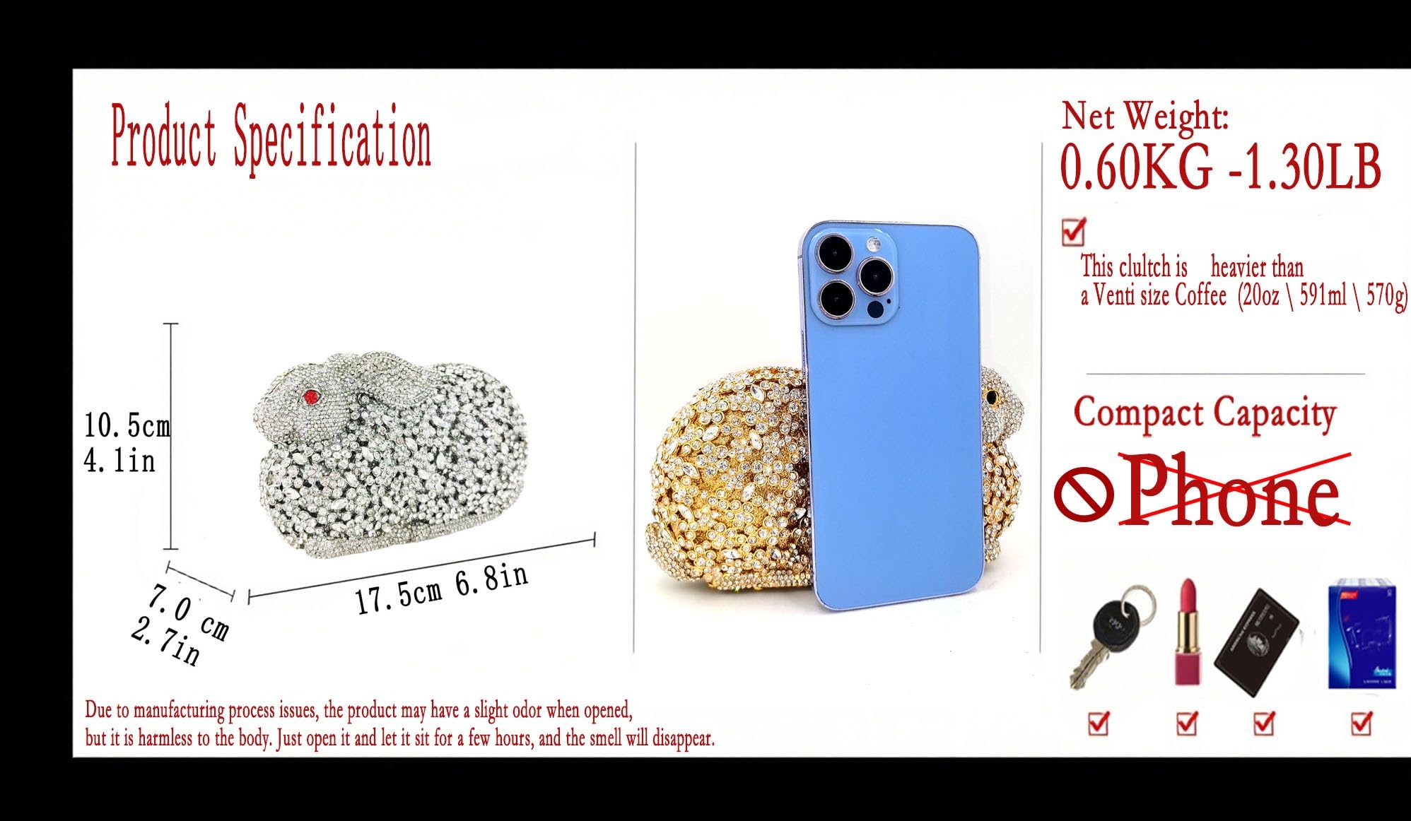 • Heavy-weight: Weighing 1.34 LB ( 0.61 KG ), this gold rabbit-shape rhinestone purse for wedding is crafted with a solid metal frame and high-quality glitter materials, ensuring durability while maintaining a luxurious feel. The robust construction adds a premium touch to your evening ensemble Its compact design makes it an ideal purse for those who prefer style without the burden of heavy accessories,this clutch purse adds a touch of glamour to weddings, proms, banquets, and parties