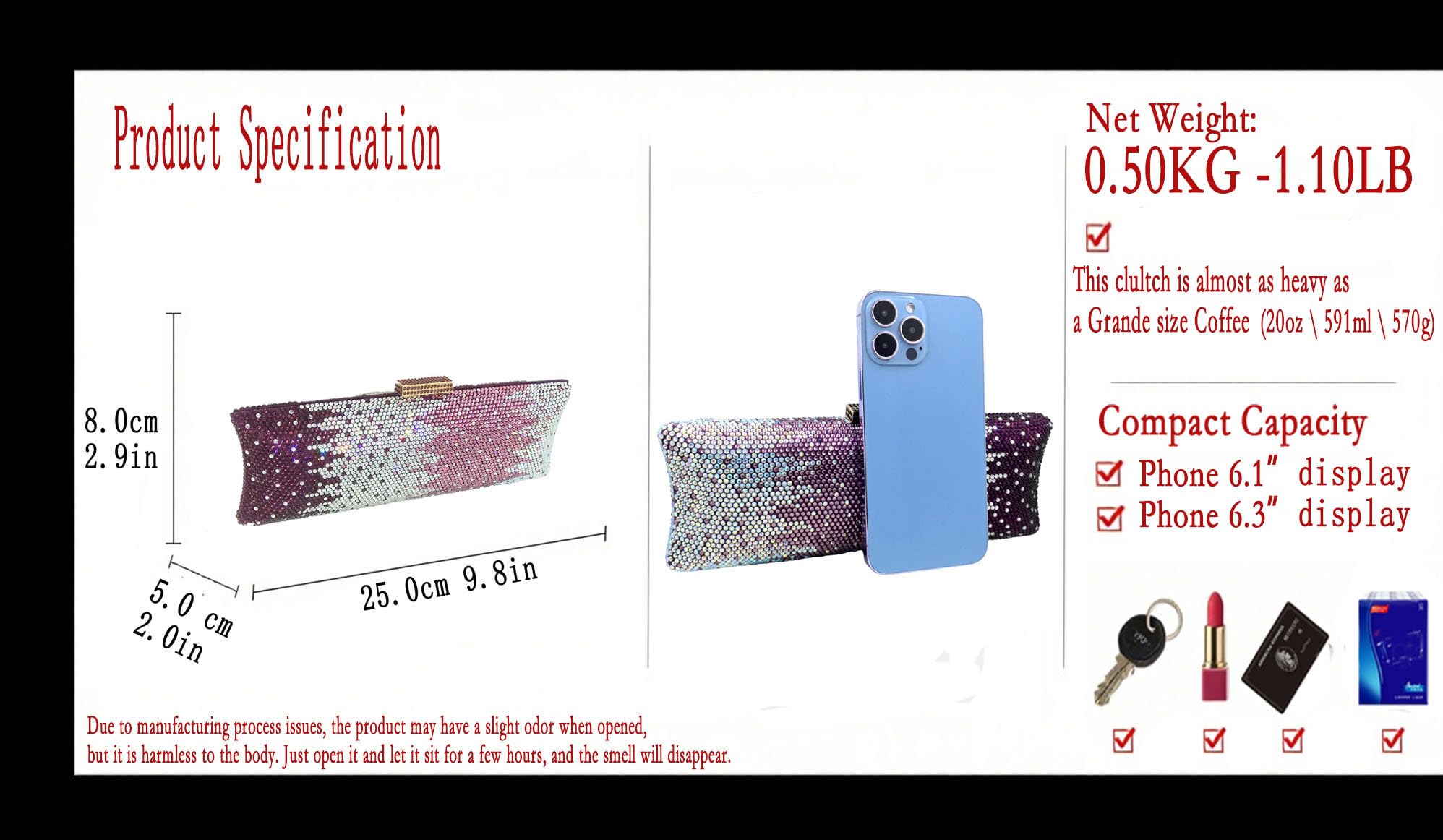 - Available for 1Phone Pro ( up to 6.3" Display ): This diamond clutch purse for women formal is perfect for essentials like phone, lipsticks, keys, tissues, and credit cards, making it a stylish yet functional evening bag for all events, also Its compact capacity makes it ideal for those who prefer style without the burden of heavy accessories, offering a hassle-free evening experience