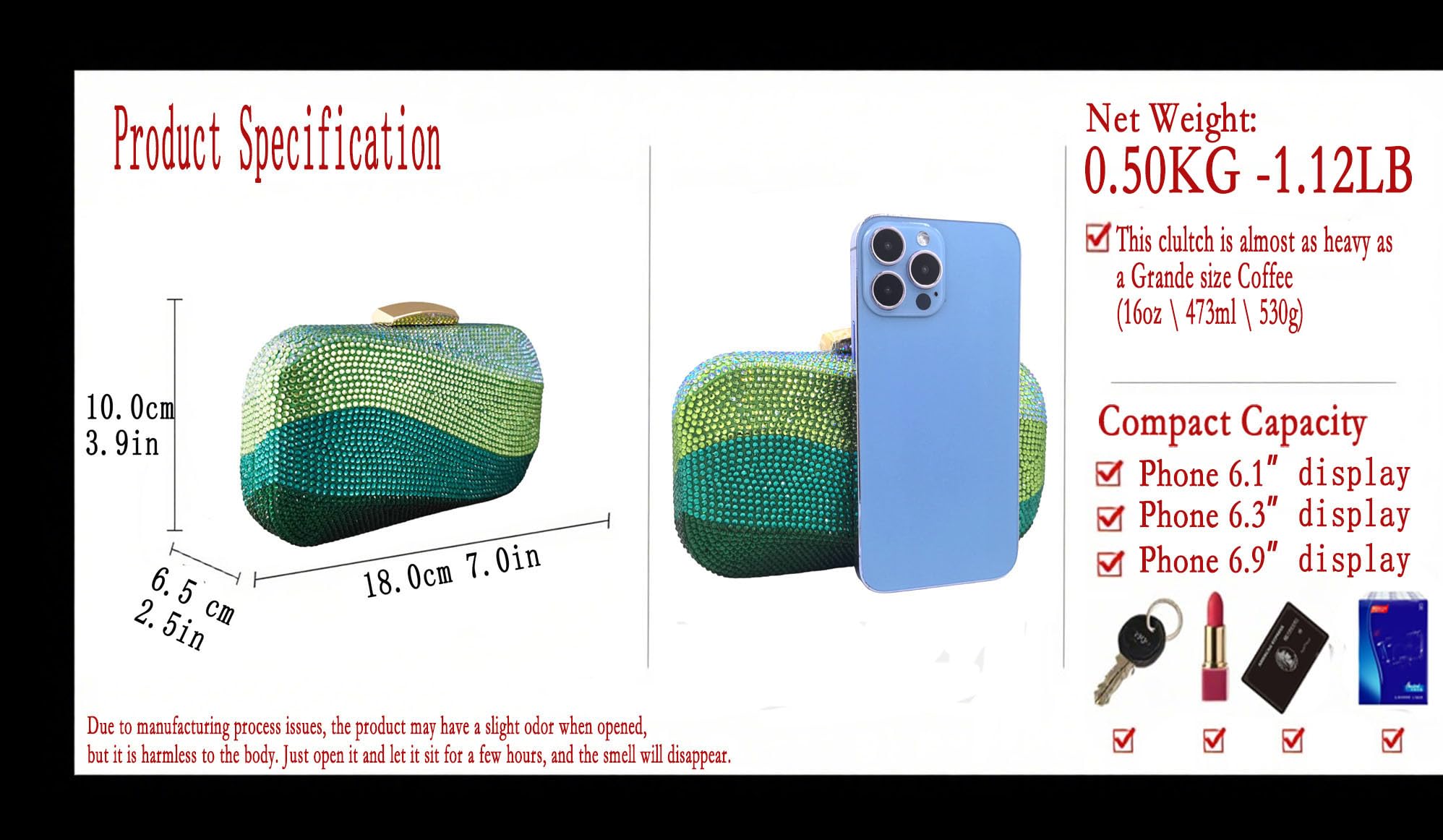 - Heavy-weight: Weighing 1.1 LB ( 0.50 KG ), This oblong-shape gradient blue minaudiere clultch is almost as heavy as a grande size coffee (16oz 473ml 530g)