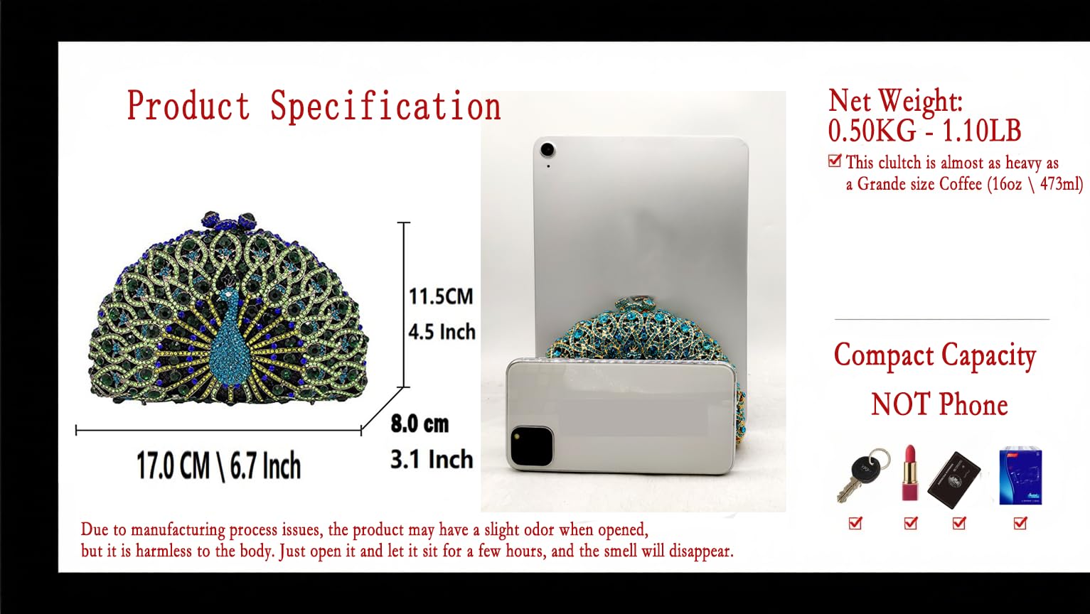 - Heavy-weight & Portable: Weighing only 0.60 KG (1.3 LB), this red peacock crystal clutch purse for wedding is crafted with a solid metal frame and high-quality materials, ensuring durability while maintaining a luxurious feel. The robust construction adds a premium touch to your evening ensemble Its compact design makes it an ideal evening clutch purse for those who prefer style without the burden of heavy accessories