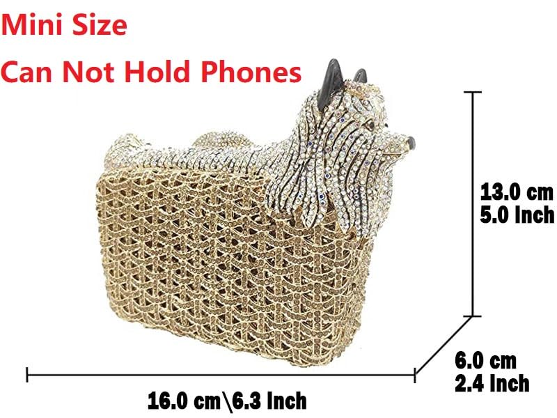 - Perfectly Mini Size for Any Occasion: Measuring 6.3 x 5.0 x 2.4 Inches ( 16.0 x 13.0 x 6.0 CM ), this dog shape brown rhinestone clutch purse for women is the perfect mini size for any event. Adorned with an abundance of dazzling crystals and a solid metal frame, this evening clutch purse for women adds a touch of glamour to weddings, proms, banquets, and parties. The soft metallic faux leather lining ensures elegance in every detail