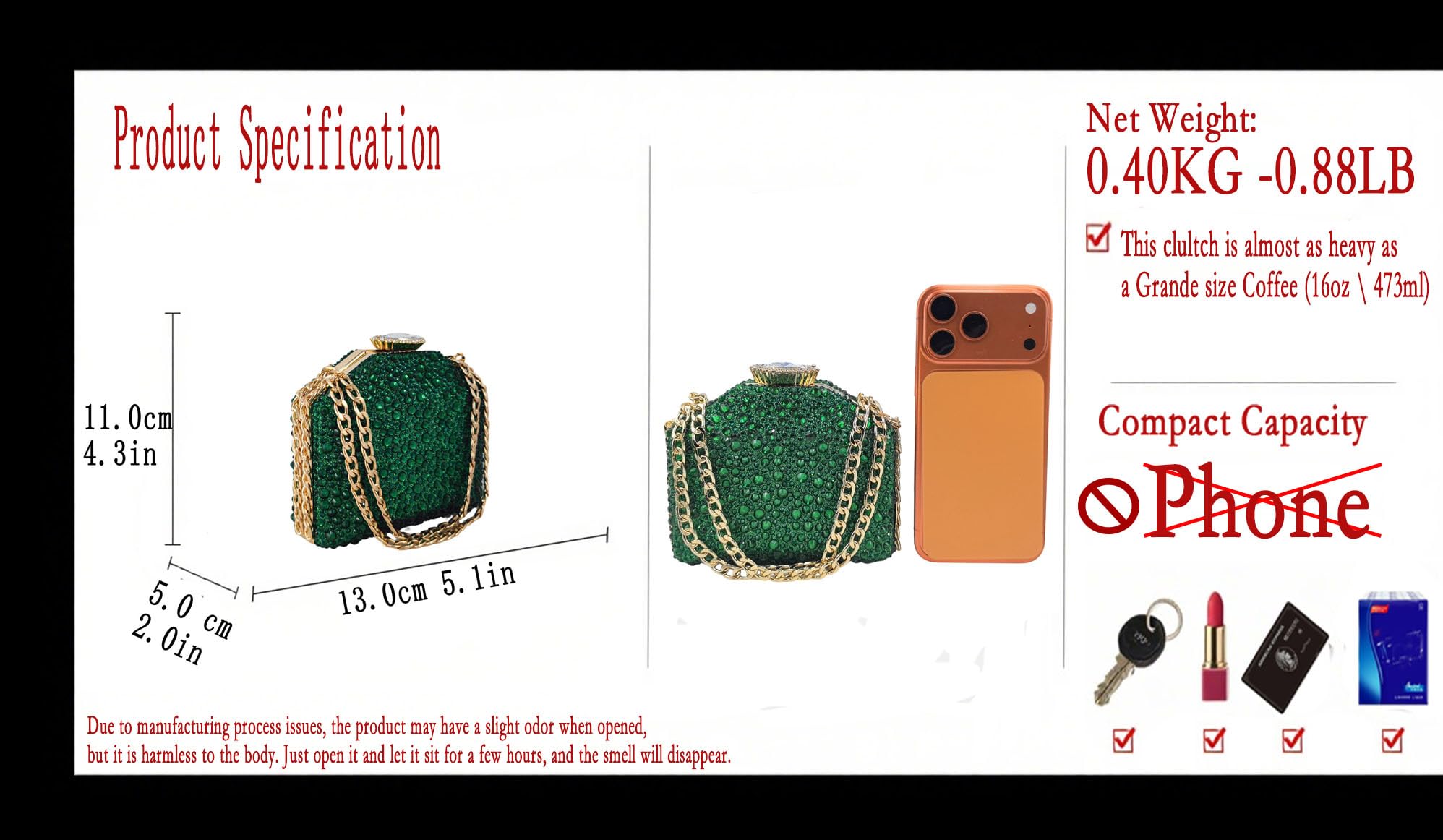 - Mini size: L 5.1 x W 2.0 x H 4.3 inches which is 13.0 x 5.0 x 11.0 CM, this brown rhinestone metal clutches bag is designed to be mini size, it can NOT hold for any phones, but it is ok for lipsticks, keys, tissues, and credit card