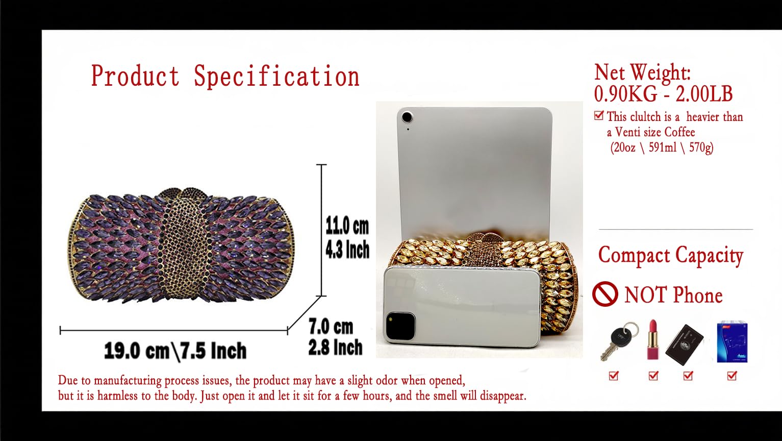 - Celebrated for our exquisite and timeless designs. Our mini evening bags and clutches for women are more than just accessories—they are conversation-starting statement pieces. Each bag features over 5,000 meticulously hand-applied mini crystals on a sturdy metal frame, radiating unparalleled sparkle and glamour. The metallic faux leather interior combines durability with chic sophistication, while the carefully selected hardware and magnetic closure ensure both beauty and practicality